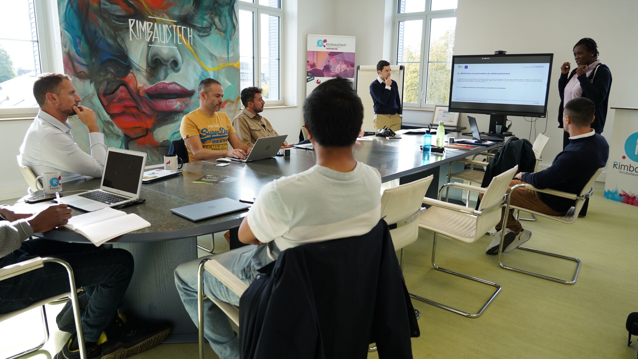 Les murs de l’incubateur de startups ardennais ont été mis en valeur par les fresques colorées réalisées par Creativ Color, apportant une touche d’identité visuelle connue et qui reflète l’esprit Rimbaud’Tech.